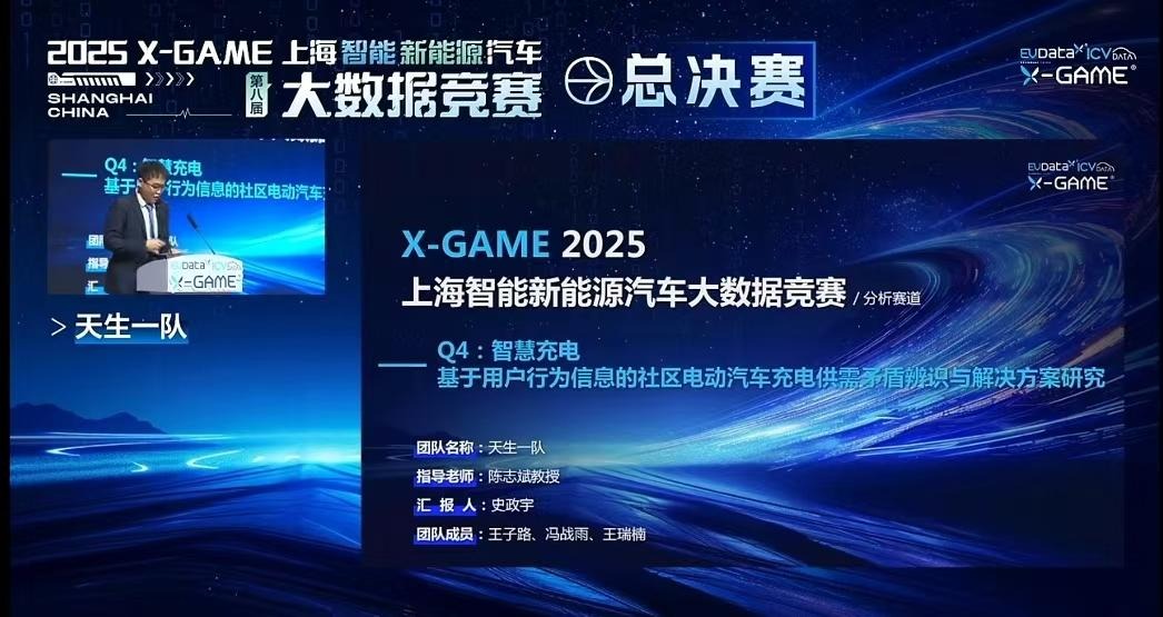 At the highly anticipated 2025 X-GAME Shanghai Intelligent New Energy Vehicle Big Data Competition Finals, Team Tian Sheng Yi Dui — composed of NYU Shanghai PhD students Zilu Wang and Ruinan Wang, and research assistants Zhengyu Shi and Zhanyu Feng — earned the First Prize in the New Energy Vehicle Data Analysis Achievement Track, receiving a cash award of 10,000 RMB.